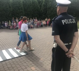 Praktyczne zajęcia z bezpiecznych zachowań przygotowały dla przedszkolaków wychowawczynie i policjanci. By najlepiej przemówić do wyobraźni najmłodszych wychowawczynie wcieliły się w rolę milusińskich i odgrywały różne zachowania na drodze.