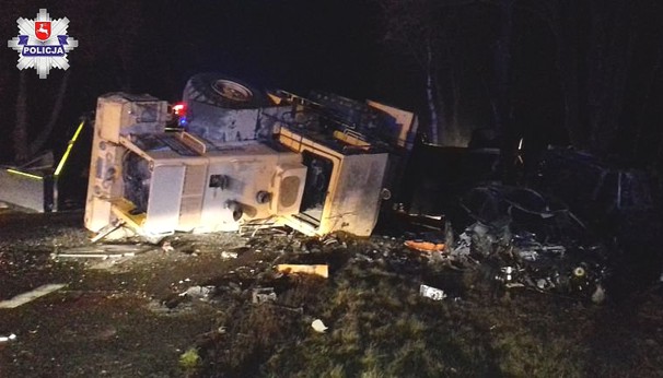 W leżący samochód ciężarowy, uderzyły jadące z naprzeciwka pojazdy marki Volkswagen Passat i Fiat Ducato. Kierujący volkswagenem, 33-letni mieszkaniec gminy Firlej jechał sam. Z uwagi na doznane obrażenia został przetransportowany do szpitala w Lubartowie. W busie natomiast podróżowało łącznie 5 osób. Kierujący nim 49-letni mieszkaniec Radzynia Podlaskiego wraz z jednym z pasażerów, zostali przetransportowani do szpitala w Lubartowie. Pozostali pasażerowie, podróżujący ducato, zostali przetransportowani do szpitali w Lublinie.