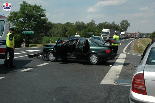 Dzisiaj, 19 czerwca po godz. 13 na skrzyżowaniu ul. Nowodworskiej z obwodnicą Lubartowa, na DK-19 doszło do zdarzenia drogowego z udziałem 3 pojazdów. Jak wynika ze wstępnych ustaleń policjantów, kierujący pojazdem marki Audi, 22-letni mieszkaniec Lubartowa nie ustąpił pierwszeństwa przejazdu i zderzył się z prawidłowo jadącym obwodnicą pojazdem marki Skoda. W skutek zderzenia kierujący skodą uderzył w stojący przed skrzyżowaniem samochód ciężarowy marki Scania.