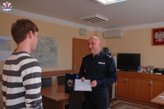 Gratulacje za godną naśladowania postawę złożył Kacprowi – uczniowi II klasy liceum, Komendant Powiatowy Policji w Lubartowie mł. insp. Andrzej Porczak. Nastolatek, na początku października, wracając ze szkoły, znalazł na drodze dużą sumę pieniędzy, które za pośrednictwem rodziców zostały przekazane policjantom.