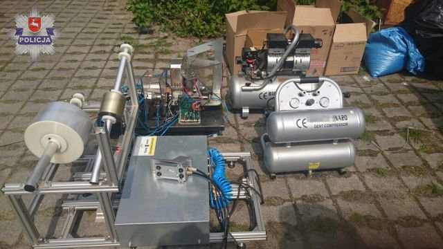 Funkcjonariusze weszli na teren jednej z posesji na lubelskim Kośminku. Podczas przeszukania garaży ujawnili i zabezpieczyli sprzęt służący do nielegalnej produkcji papierosów: dwie profesjonalne maszyny tzw. kompresory, foliownicę do pakowania, a także produkty i półprodukty: 20 kilogramów krajanki tytoniowej, ponad tysiąc paczek wytworzonych papierosów bez akcyzy, a także butelki z aromatami. Na tej samej posesji policjanci natrafili także na oprzyrządowanie służące do uprawy marihuany: lampy, wentylatory, elektroniczne wagi, nawozy, donice i filtry.