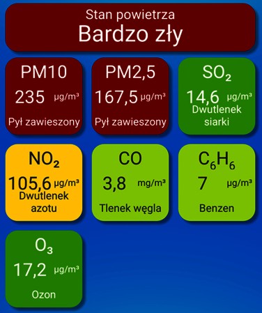 Podawaliśmy, że o godz. 16, w Lublinie stężenie pyłów PM2.5 wynosiło 128, a PM10 – 59 µg/m3. Wieczorem zrobiło się fatalnie. Stężenie PM2,5 wynosiło już 167,5 µg/m3, a PM10 235. Dokładne pomiary pokazuje tabelka. Na godzinę 23 w niedzielę, wskaźnik z ul. Obywatelskiej informował dalej o „Zagrożeniu dla życia” - podając wskaźnik 305, a PM2.5 wynosiło 217, PM10 – 140 µg/m3.