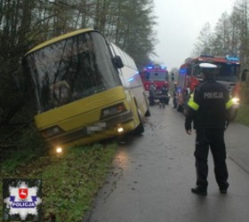 Do groźnie wyglądającego zdarzenia doszło dziś rano, 27 października. Autobus wiozący dzieci do szkoły podczas wymijania się z jadącym z naprzeciwka pojazdem zjechał na grząskie nieutwardzone pobocze i zsunął się do rowu.