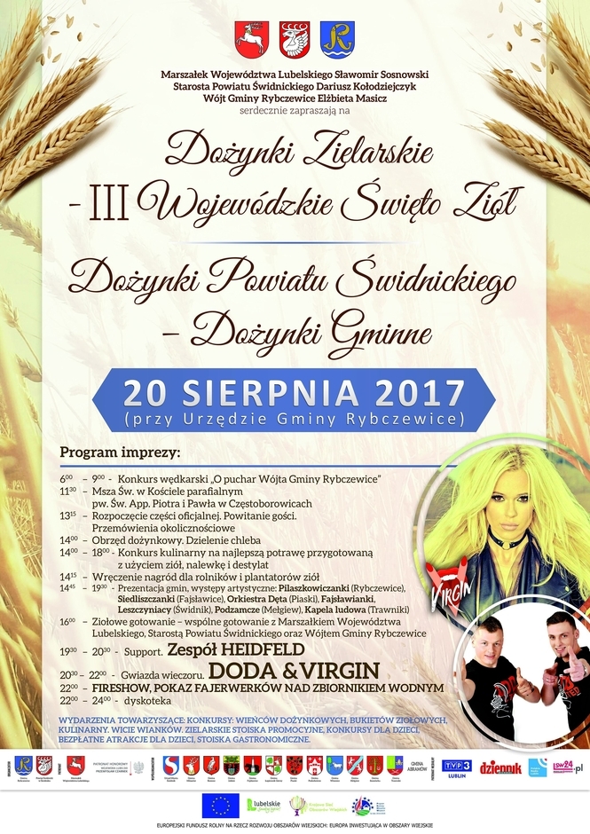 Na scenie zaprezentują się zespoły ludowe. Na godz. 19.30 zaplanowano występ zespół Haidfeld. Gwiazda wieczoru DODA & VIRGIN rozpoczną koncert o godz. 20.30. Dożynki zakończy o godz. 22 pokaz fajerwerków nad zbiornikiem wodnym w Rybczewicach Drugich.