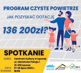 Generalny wykonawca zaprasza osoby zainteresowane dofinansowaniem w ramach programu „Czyste Powietrze” na spotkanie informacyjne. Spotkanie odbędzie się w poniedziałek i wtorek 17 i 18 lipca 2023 r. o godzinie 18.00 w Centrum Kultury w Łęcznej, ul. Obrońców Pokoju 1, 21-010 Łęczna.