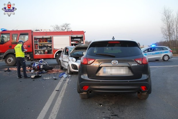9 kwietnia o godzinie 18:25 dyżurny lubartowskiej komendy otrzymał zgłoszenie o zdarzeniu drogowym do którego doszło na obwodnicy drogi krajowej nr 19 z ul. Nowodworską w Lubartowie. Ze wstępnych ustaleń policjantów wynika, że 60-letnia kobieta kierująca pojazdem marki Citroen, wymusiła pierwszeństwo przejazdu i zderzyła się z prawidłowo jadącym obwodnicą motocyklem m-ki Kawasaki, a następnie uderzyła w stojącą na skrzyżowaniu mazdę. W wyniku tego zdarzenia obrażeń ciała doznał 23-letni kierujący jednośladem, mieszkaniec Międzyrzeca Podlaskiego. Został on przetransportowany do szpitala w Lublinie.