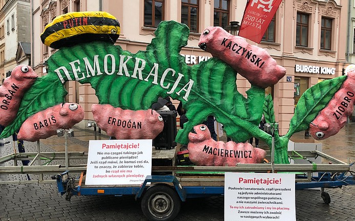 Wcześniej w kilkunastu miastach Lubelszczyzny pojawiła się instalacja obrazująca wg jej twórców zjadanie demokracji przez szkodników. Na instalacji znajduje się zielony liść podpisany jako „demokracja”. Jest zjadany przez robale, które mają symbolizować polskich i zagranicznych polityków, m.in. Władimira Putina, Viktora Orbana, Jarosława Kaczyńskiego, Antoniego Macierewicza i Zbigniewa Ziobro. Liść pojawił się już m.in. w Niemczech i Czechach. 22 listopada instalacja była w Lublinie.