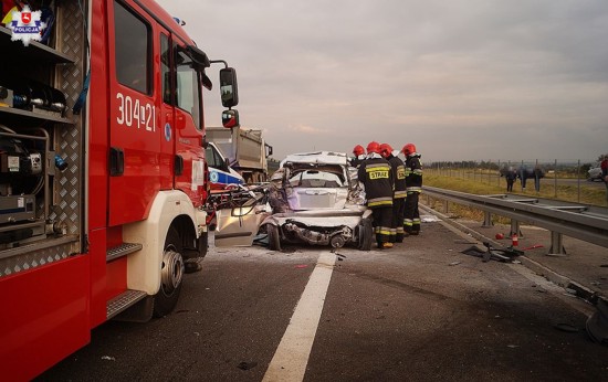 Policjanci wyjaśniają okoliczności tego wypadku. Ze wstępnych ustaleń wynika, że chwilę wcześniej w tym miejscu doszło do kolizji ciężarowego dafa z kierującym samochodem marki BMW. W ciężarowym pojeździe pękła opona. Stało się to w chwili gdy był wyprzedzany przez bmw. Oba pojazdy zjechały na prawe pobocze aby sprawdzić co się stało. Elementy wystrzelonej opony zostały na prawym pasie drogi. To przed nimi zatrzymał się jadący prawym pasem kierujący hyundaiem. Jadący za nim kierujący ciężarowym volvo już nie zdążył wyhamować i wjechał w hyundaia. W wyniku zderzenia kierowca i pasażer z hyundaia trafili do szpitala. Siedząca za nimi kobieta pomimo prowadzonej reanimacji zmarła. Policjanci ruchu drogowego KMP w Lublinie prowadzą czynności na miejscu zdarzenia.