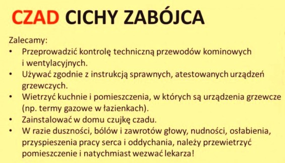Czad (tlenek węgla) to silnie toksyczny gaz, który jest bezbarwny i bezwonny. Człowiek nie jest w stanie go wyczuć ani zobaczyć. Najbardziej zagrożone są osoby, które korzystają z wszelkiego rodzaju pieców, kotłów gazowych lub CO. Jeśli nie ma dostatecznej ilości tlenu podczas spalania powstaje śmiertelny gaz. W odpowiednim stężeniu potrafi najpierw uśpić, a potem zabić ofiarę w kilkanaście minut.