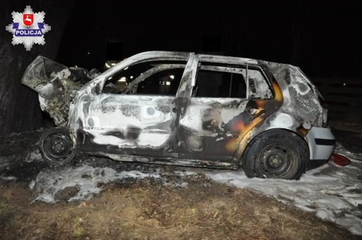 Do zdarzenia doszło na drodze powiatowej w miejscowości Piotrawin. (pow. lubelski, gm Jastków). Około godziny 2.40 policja otrzymała informację o wypadku i pożarze samochodu. Kierujący vw golfem zjechał z drogi na lewe pobocze i przodem pojazdu uderzył w drzewo. Po wypadku samochód zapalił się. Po ugaszeniu pożaru przez strażaków wewnątrz znaleziono zwęglone zwłoki kierowcy.