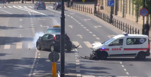 Przed południem doszło dziś do kolizji na skrzyżowaniu ulic 3-go Maja i Żołnierzy Niepodległej. Jadący na sygnałach pojazd do przewozu krwi zderzył się z toyotą, która następnie uderzyła w jadącego z przeciwka volkswagena. Zdarzenie zarejestrowały kamery monitoringu miejskiego.