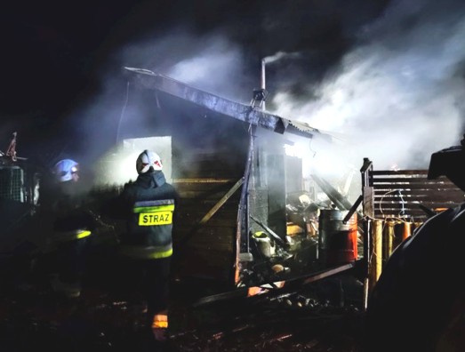 Jak się okazało paliła się drewniana altanka używana do celów mieszkalnych. Budynek w całości objęty był ogniem. Działania strażaków były utrudnione z powodu dużej ilości łatwopalnych materiałów zgromadzonych na posesji.