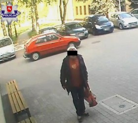 Policjanci poszukują mężczyzny widocznego na nagraniu z monitoringu. Zauważył on torbę z laptopem pozostawioną przy ławce i ukradł go.