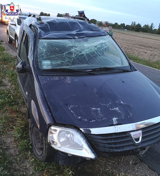 Kierujący dacią stracił panowanie nad pojazdem i dachował. Dwóch nietrzeźwych uczestników zdarzenia trafiło do policyjnego aresztu, ponieważ żaden z nich nie przyznawał się do kierowania. Gdy mężczyźni wytrzeźwieją jeden z nich usłyszy zarzut kierowania w stanie nietrzeźwości. Odpowie też za popełnione wykroczenia.